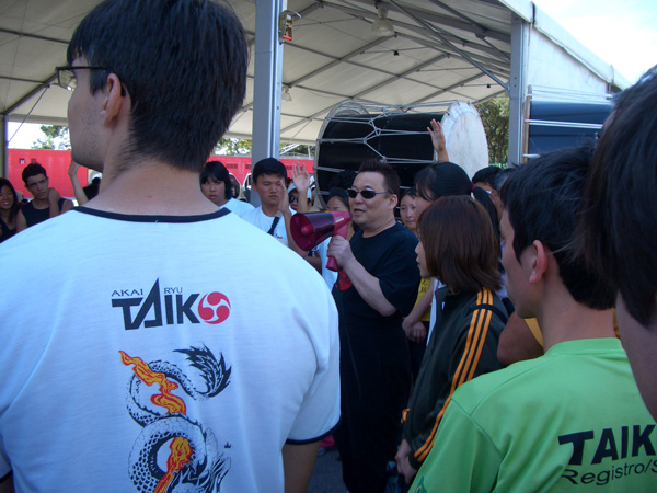 4年前の2004年にブラジル支部「ブラジル太鼓協会」が発足された際にも、私達天邪鬼はブラジルを訪れ、記念公演を行いました。その後、100周年記念式典に向けて、千人太鼓を演奏する構想が持ち上がり、御諏訪太鼓の小口大八宗家と天邪鬼の渡辺洋一先生の合同楽曲「絆」が作られました。そして、その指導のために、翌年から渡辺先生と影山が1ヶ月間に及ぶ指導を3回、御諏訪太鼓の古屋氏・松枝氏に影山が同行指導1回、合計4回の指導を行い、昨年からはJICAから派遣された箕輪氏が指導を受け継いで下さっていました。