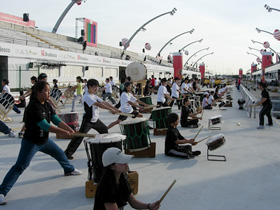 この度は(財)日本太鼓連盟の事業の一環として2004年にサンパウロ、リオデジャネイロ、マリンガの三箇所でコンサートツアーを行い、2005年に基礎技術の指導、2006年には国外で初となる5級検定試験の実施、2007年からは日本ブラジル移民100周年を祝した「千人太鼓」の指導、そして2008年には集大成となるコンサートと千人太鼓の最終指導のため、合計5回ブラジルを訪れました。