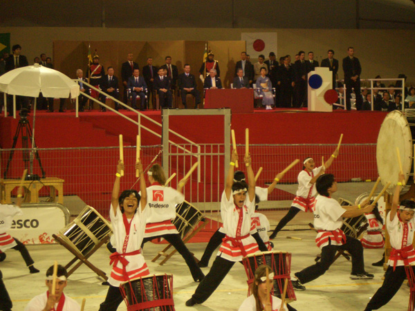 百周年の記念式典は、サンパウロ市内のサンバ会場で行われました。3万7千人の観衆の前で、日本ブラジル移民100周年記念曲「絆」を1200人は、完璧に演奏してくれました。つたない日本語の「よろしく~おねがいまぁすぅ~」で始まり、目をきらきらと輝かせて力強い掛け声で打つ若者達の演奏は大変印象的で、また最後に頭を深々と下げて 「ありがとう~ございました~」という姿は、好感とともに清々しいものでした。