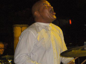 彼のドラミングは、本当に変わっていて、ドラマーなのに、乗って来ると、立ってドラムを打ち始めたりする! 身体はでかいのに、その音は円やかで、普通では、うーん 私では考えつかない所で、美味しいフレーズを出す! そして、そのフレーズは本人も二度と出来ない! 野生と感性が交互に出てきて… それは素晴らしいのです。 彼が演奏に加わると、音の厚みと、方向性を示すガイドラインが、リズムの中に、ゆとりを生ませて、安心できる! 音楽家にとって必要なセンス・テクニックだと、改めて共感させられた。