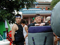特筆すべきは・・・まず、出で立ち。衣装は一応半纏を着ているのだが、着付け方が反対で死装束と同じ右前にあわせてあり、下は半ズボンで中は普通のベルトをしている。足元は地下足袋、さらしは巻かず、Tシャツ。鉢巻は、ただのヒモ。 このデンバー太鼓の衣装の不思議な感覚を例えて表すとしたら・・・。