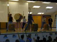 いくつかの基本手組を試して休憩を10分間とり、再度練習に入る。曲を教えたが、先程の基本的な打法だけでは太鼓を打てない。(デンバー太鼓の亜流のクセが出てしまう)とにかく、あまり焦らないで、また、子供たちをしからずに曲を細かく丁寧に教えていき、なんとか4パターンの基本手組を教える事ができた。