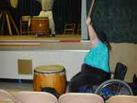 次は、デモンストレーションで影山が大太鼓、私が締太鼓を演奏し、最後にデュオで中・大太鼓、二つの太鼓で演奏をした。(特に和太鼓説明、効果音の所は太鼓を打ちながら効果音を出す時には、マイクが欲しかった。)そして、最後に、一般の人に和太鼓を打ってもらうワークショップを行った。